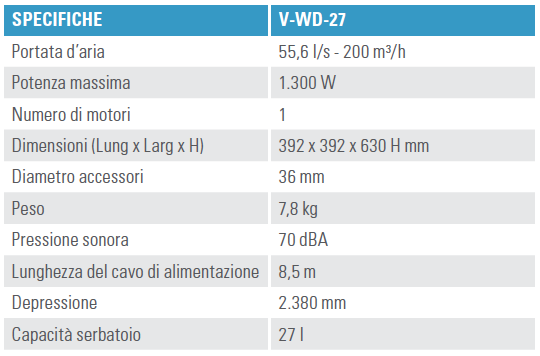 Versatile, maneggevole e leggero, rimuove liquidi e polveri con un serbatoio da 27 litri.